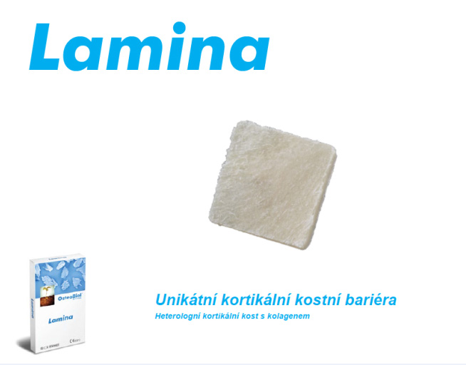 Nový typ kortikální laminy (OsteoBiol) slouží k překrytí augmentačního materiálu při rozsáhlých 3D augmentacích a u velkých kostních defektů. Jedná se o bovinní typ kortikální kosti.