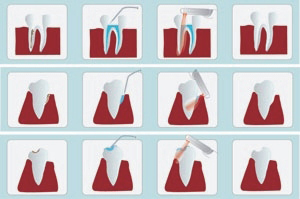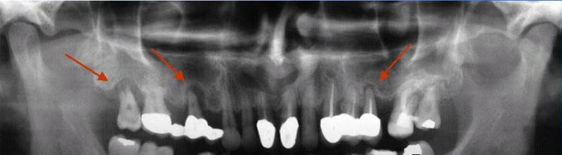 parodontu (závěsného aparátu zubu, přilehlé kosti a dásní).